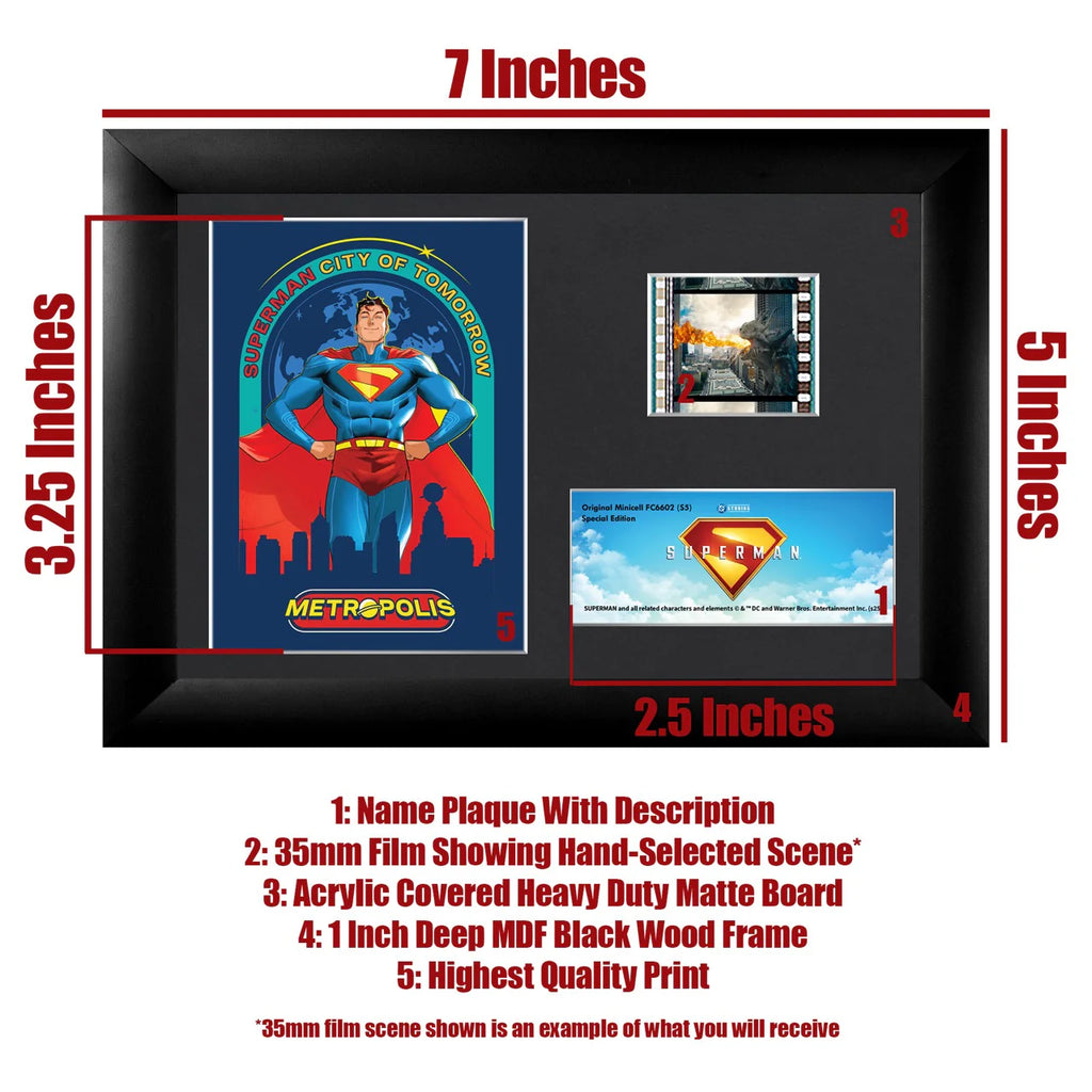 Celebrate The Last Son of Krypton with this officially licensed Superman Minicell FilmCells™ collectible. Featuring vibrant comic-style artwork of Superman standing heroically over the Metropolis skyline, this framed presentation also includes a genuine 35mm film cell from the movie, making each piece truly one-of-a-kind.