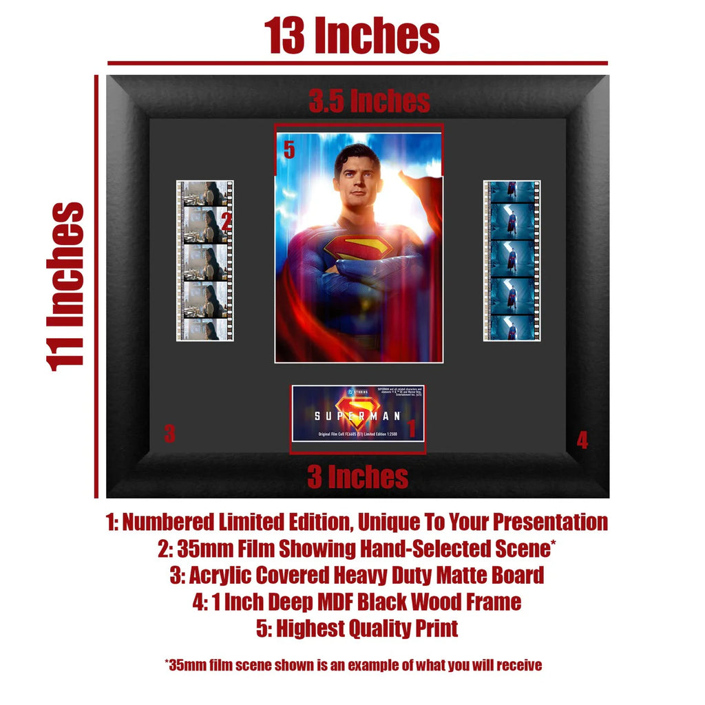 Celebrate the legacy of the Man of Steel with this officially licensed Superman (2025) Double FilmCells™ collectible. Featuring striking imagery of Superman standing confidently against a luminous sky, this presentation includes two genuine 35mm film strips, making each piece a one-of-a-kind treasure. Professionally mounted in a sleek 13” x 11” black MDF frame with double matting, it also features a title plaque displaying the Superman emblem and edition details.