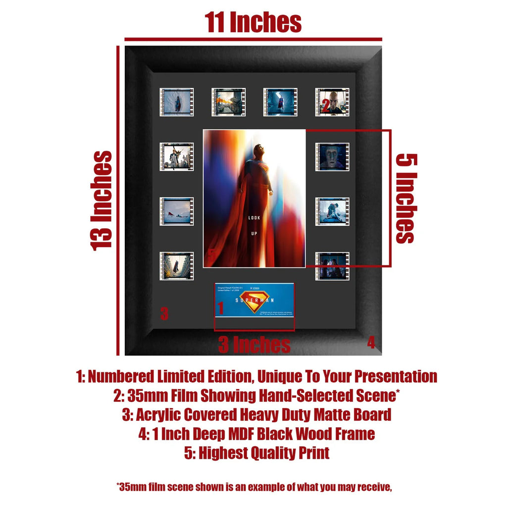 Celebrate the legendary return of Superman with this officially licensed Mini Montage FilmCells™ collectible. This limited-edition presentation showcases a powerful image of Superman from the upcoming film, standing tall in radiant light beneath the bold phrase “LOOK UP.” Surrounding the artwork are 10 genuine 35mm film cells, hand-cut from the actual movie reel—giving fans a rare, tangible piece of cinematic history.